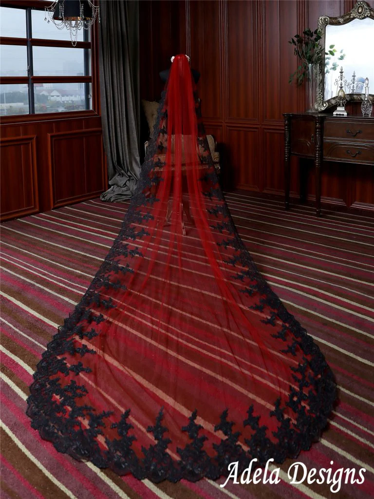 Dark red tulle with black lace edge long veil.