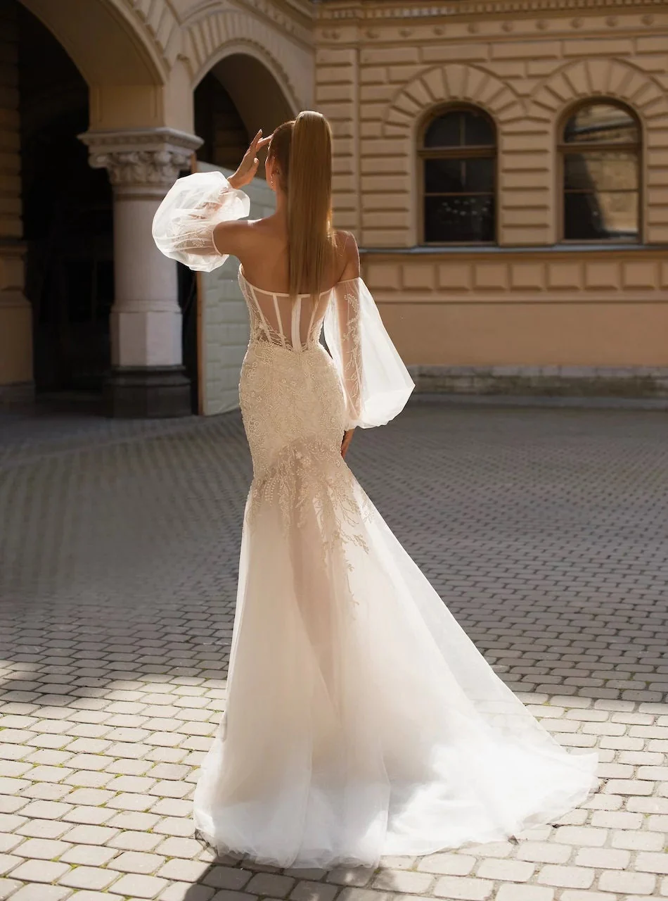 Sexy Sparkling Sleeveless Strapless Fit and Flare Wedding Dress Bridal Gown Sweetheart Neckline Bustier Corset Detachable Balloon Sleeves