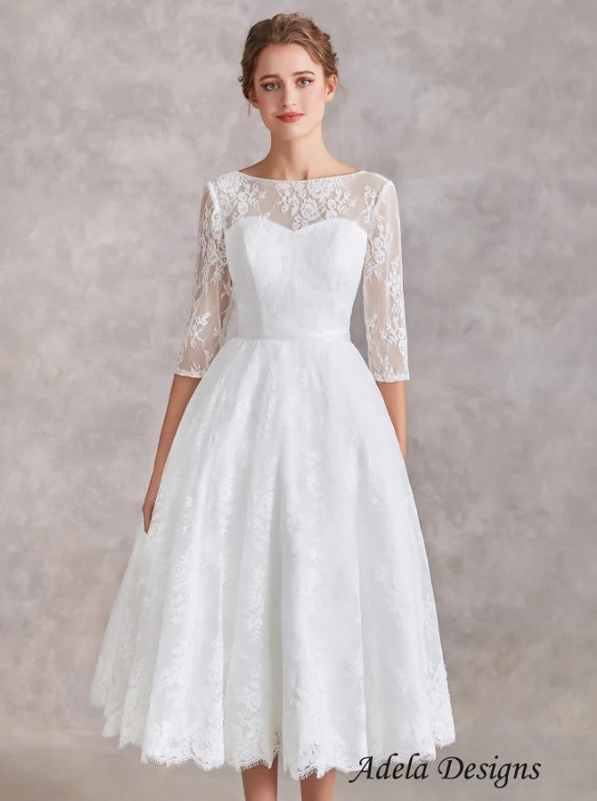 Vintage lace tea-length short wedding dress with 3/4 sleeves.